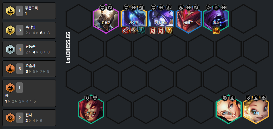 초반 난동꾼 특성을 보유한 스카너와 말파이트를 활용하며 빌드업하기에 초·중반 경기의 체력 관리가 용이하고 튼튼한 난동꾼과 전사를 기반으로 전투 운영할 수 있습니다. [시즌7]의 오른과 쉔 대신 새로이 추가된 잭스를 기용하여 난동꾼 특성을 활성화하고, 여전히 사이펜 2성작이 핵심입니다. 후반에 도달하였다면 야스오와 요네를 기용하여 유리한 전투 구도로 승리할 수 있습니다.