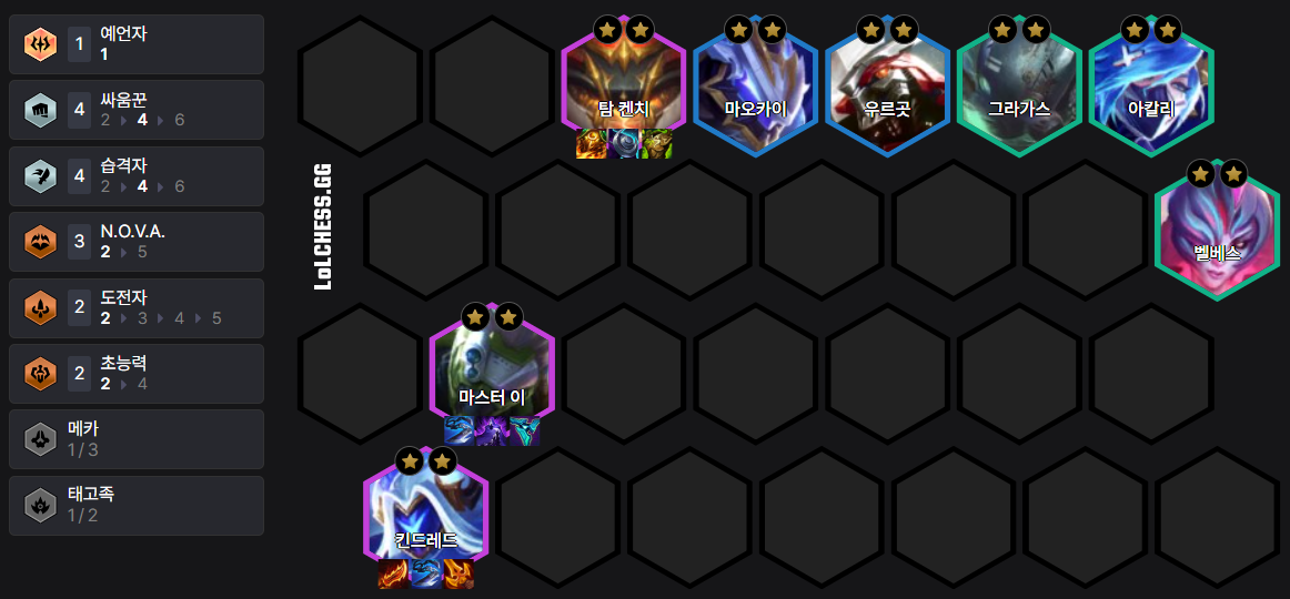 · 습격자 상징이 없을 때 아래와 같이 (4)싸움꾼, (4)습격자 특성으로 팀 구성을 완성합니다.